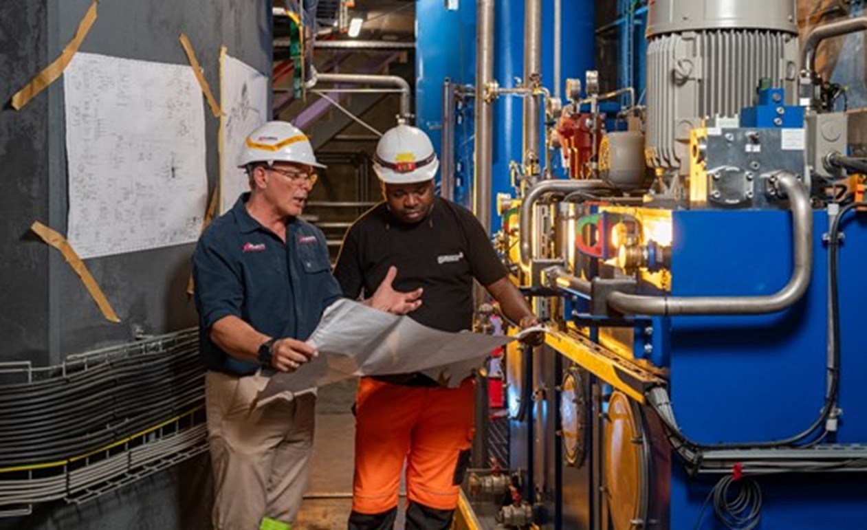 (左起) 卡莫阿铜业建设经理Kasper Badenhorst及Gruner Stucky AG公司的机械工程师Papy Enona在5号涡轮机组试车期间审查试车方案。