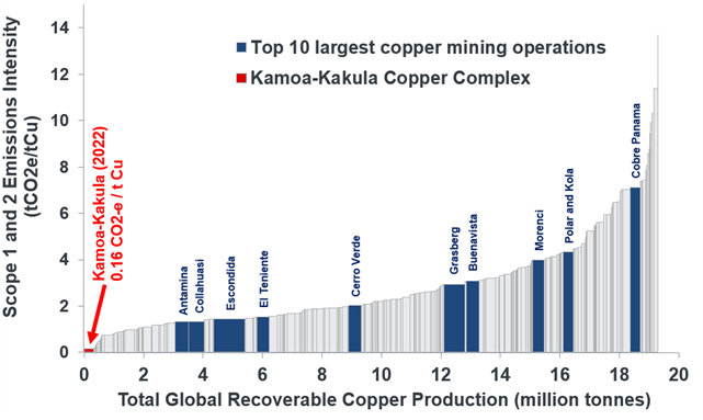 卡莫阿–卡库拉2022年的温室气体排放 (范围一和二,即从矿石到产品运离矿山) 强度为每生产一吨铜排放0.16吨二氧化碳当量 (二氧化碳当量/吨铜),使卡莫阿–卡库拉处于温室气体排放曲线 (范围一和二) 近乎最底部。