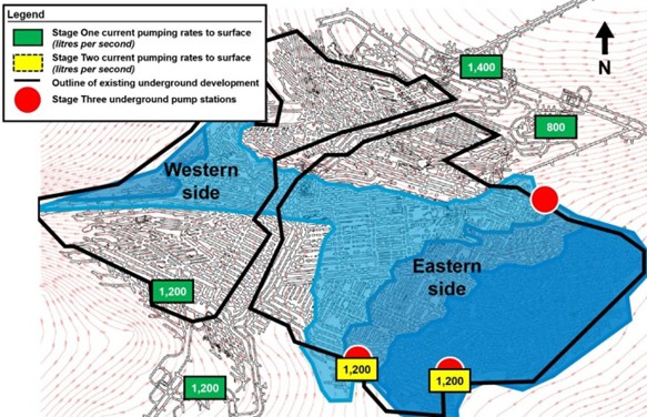 第三阶段的抽水作业将处理第二阶段可以从地面操作的大功率水泵无法进入水位以下的剩余排水工作 (见图1)。采矿班组将于11月份开始使用第三阶段现有的抽水设施,在每个泵站进行改装,并配备新泵电机和相关电力设施。预计第三阶段抽水作业将于2026年第一季度完成。