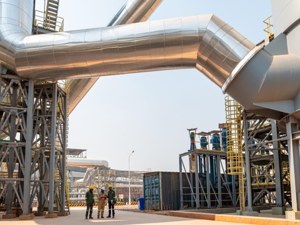冶炼厂工作人员在点火烘炉前检查硫酸车间。预计冶炼厂每年将生产约70万吨的浓硫酸副产品。中非铜矿带对硫酸有巨大需求。