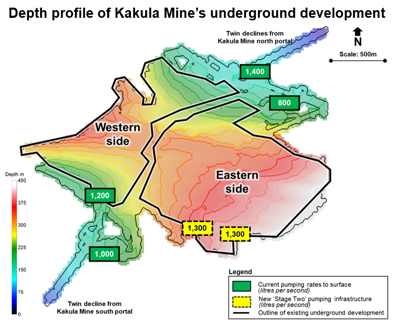 图1:截至2025年6月,卡库拉矿山井下基础设施示意图,显示矿山东、西区的深度以及第一阶段现有和第二阶段将新增的垂直抽水位置。