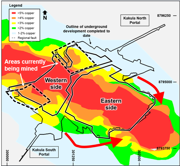 图2:卡库拉矿山井下基础设施的示意图,显示铜品位分布以及东区新采区拟建的两条主巷道的位置 (红色箭头)。