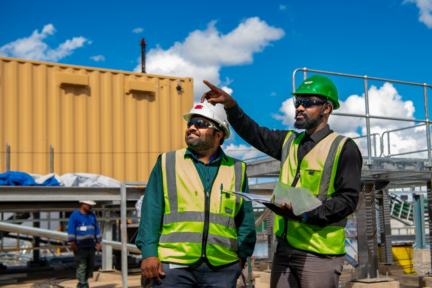 (左起) Mining Chemical Suppliers公司主管 Akshay Panchal 和安全主任Moise Kibambe 就基普什扩产方案监督主变电站的电缆安装。