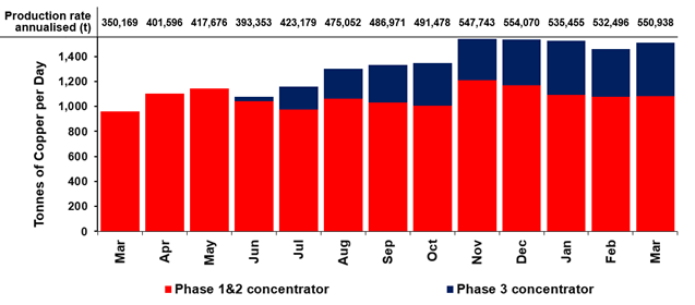图 1﹕卡莫阿–卡库拉 I 期、II 期和 III 期选厂过去12个月的铜产量月度增长,上方数值为对应的年化产量。