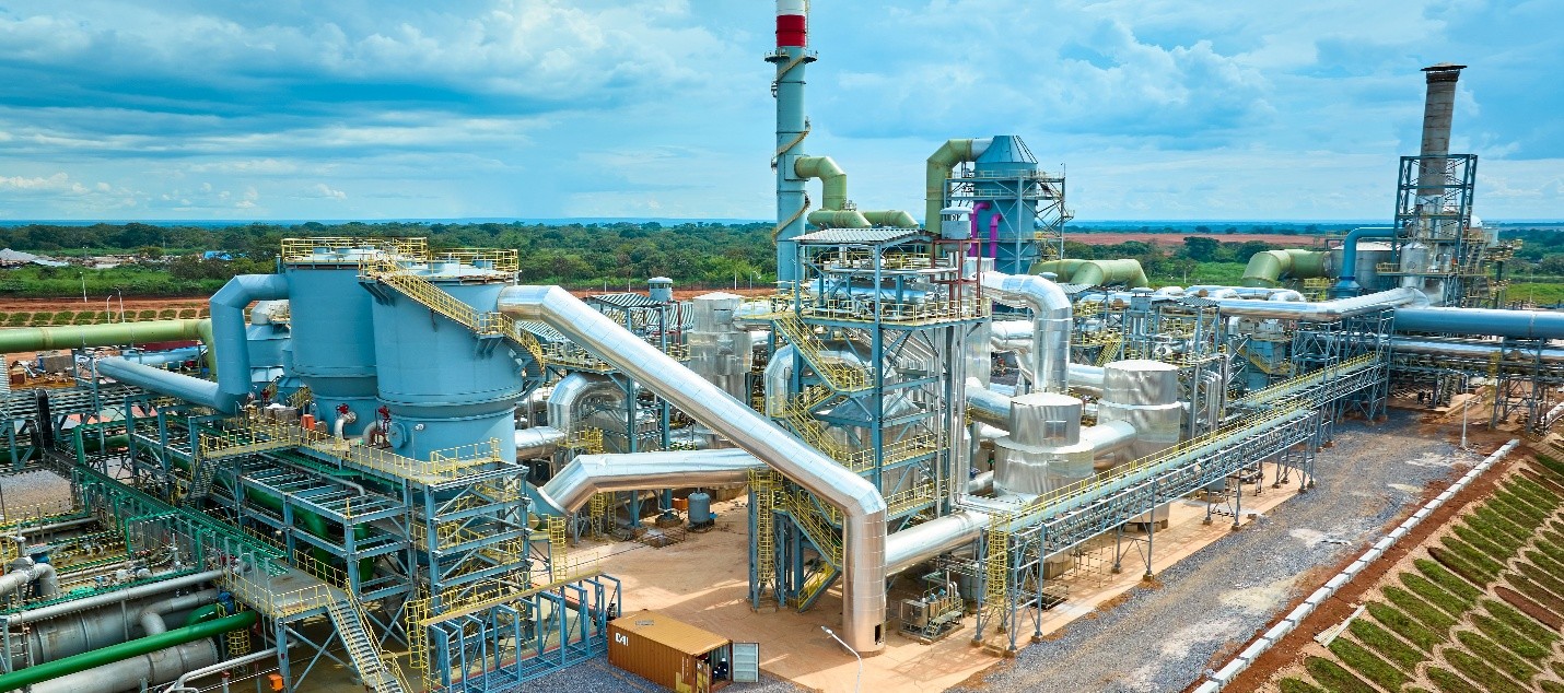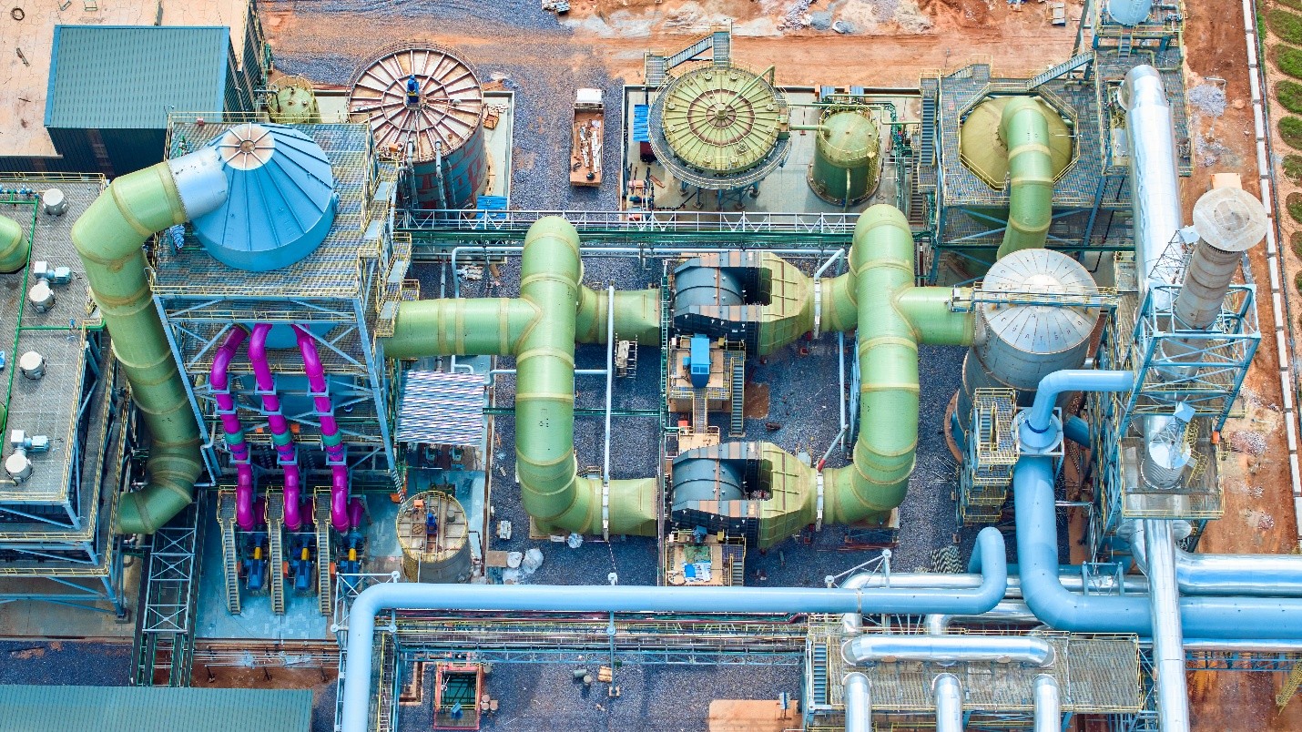 卡莫阿–卡库拉冶炼厂的烟气处理厂。该装置可将熔炼过程中捕获的烟气转化为高浓度硫酸,在刚果(金)铜矿带销售。