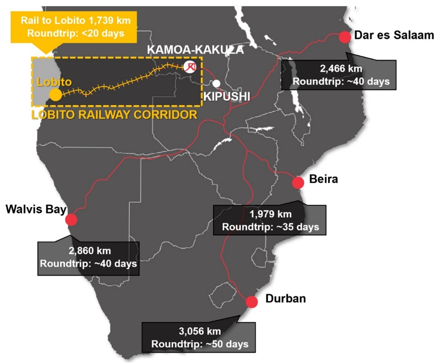 图2﹕卡莫阿–卡库拉目前使用的出口路线图 (红色) 以及洛比托铁路走廊的路线图 (橙色)。由于陆路运输精矿到港口的距离遥远,仅物流成本已占卡莫阿–卡库拉 C1 现金成本的30%。