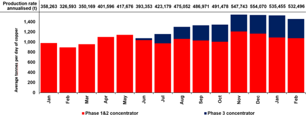 卡莫阿–卡库拉 1月份破纪录产铜 4.5 万吨,天数最少的2月份产铜 4.1 万吨。1月份平均单日产铜 1,467吨,2 月份则为1,459吨,仅次于2024年12月创下单日产铜1,518吨的纪录。