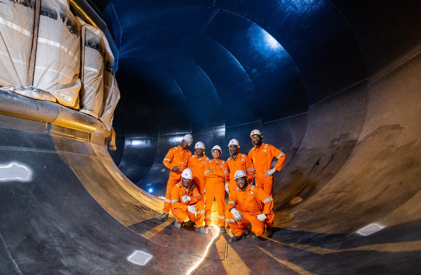 Prezioso Congo SA 公司的喷砂和喷漆班组在新建的英加二期水电站5号涡轮机组 (178兆瓦) 的蜗壳内