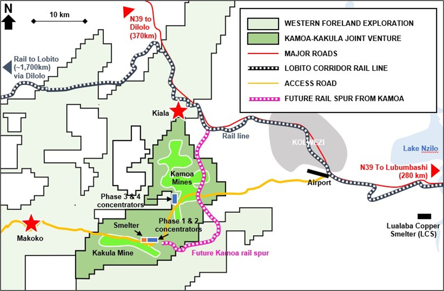 3﹕卡莫阿–卡库拉采矿权和西部前沿的探矿权范围及现有的公路和铁路基础设施,以及规划中连接洛比托铁路走廊与卡莫阿–卡库拉的未来支线。