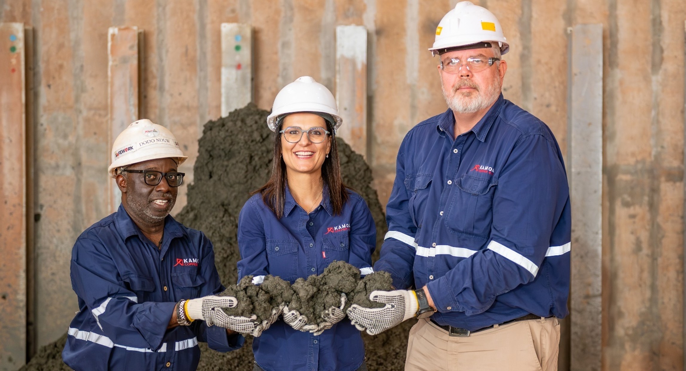 左起﹕卡莫阿铜业选厂主管 Dodo Mbay、董事总经理安妮贝尔·奥斯图伊森以及前任董事总经理瑞安·魏美伦于 2024年6月手持 III 期选厂出产的首批精矿。