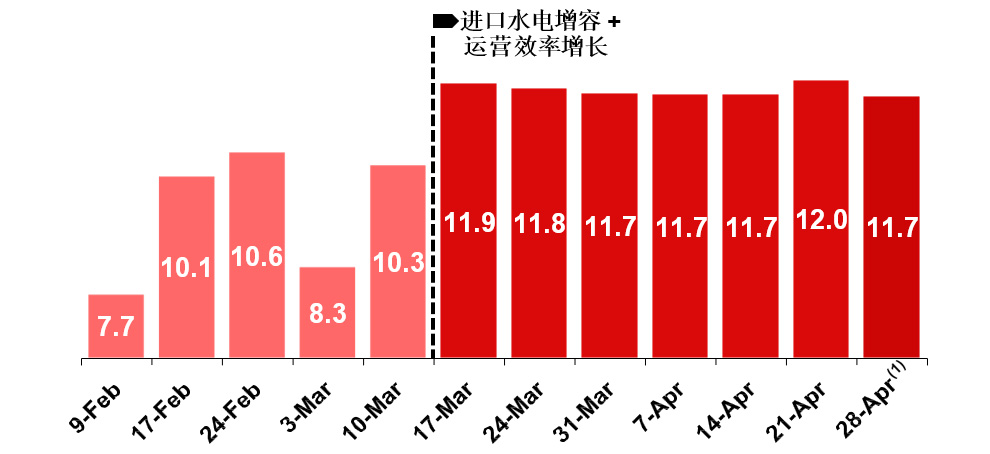 - 3 月中旬从外部进口水电增容20 兆瓦至70 兆瓦。第二季度将进一步增容至 100 兆瓦。2025年下半年,随着冶炼厂推进产量爬坡,预计从电网引入电力将进一步扩大。