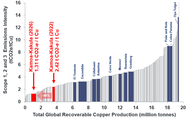 - Skarn Associates编撰的同业数据显示,卡莫阿–卡库拉铜矿的温室气体排放 (范围一、二和三(部分)) 强度处于最低十分位之内。III 期扩建及冶炼厂竣工后,估计卡莫阿–卡库拉的排放 (范围一、二和三) 强度将接近减半至31当量二氧化碳/吨铜。