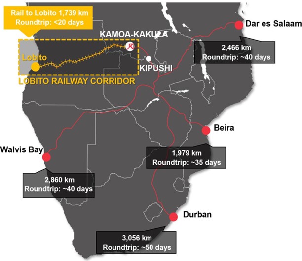 - 卡莫阿–卡库拉于2023年底试行经洛比托大西洋铁路走廊运送铜精矿出口。卡莫阿–卡库拉最近已签署条款协议,概述了预留承运协议的关键条款,约定自2025年起每年经洛比托走廊出口多达24万吨铜产品,使卡莫阿–卡库拉成为现代洛比托走廊的首名工业用户。