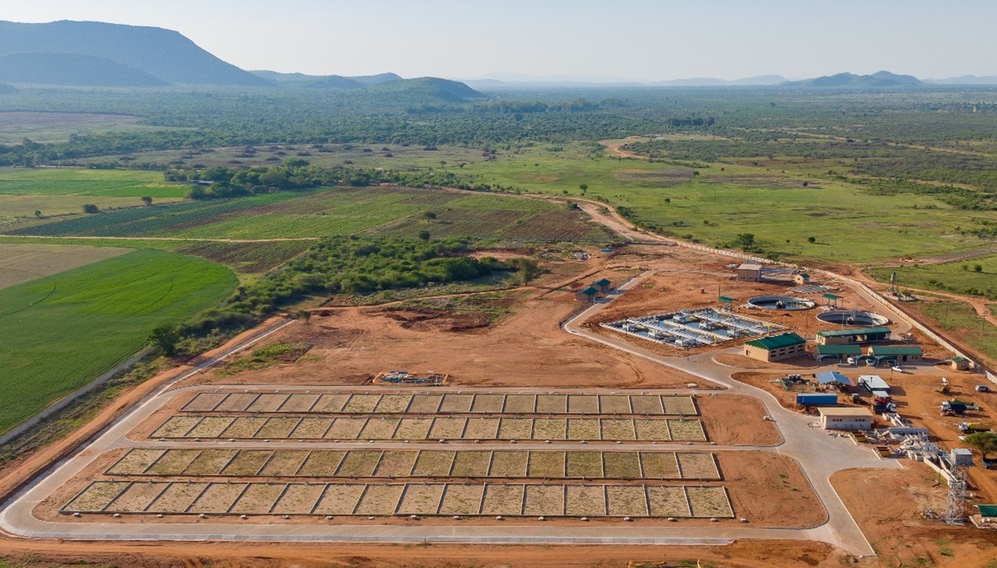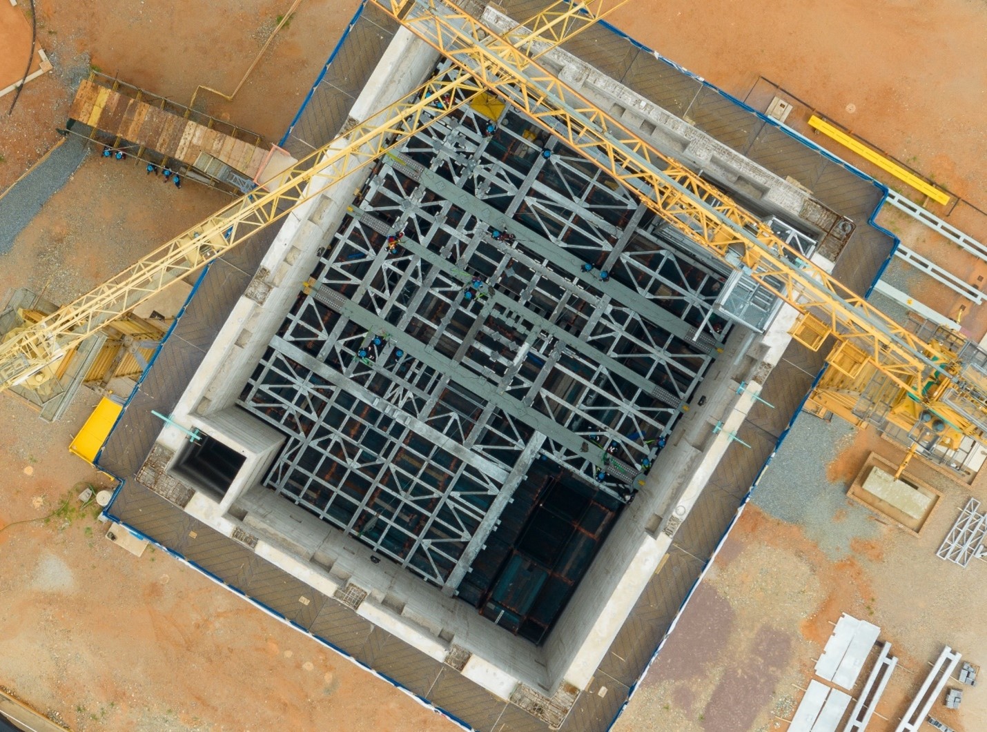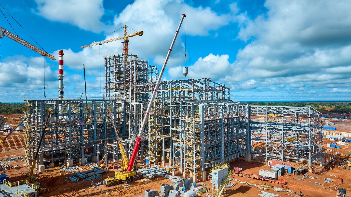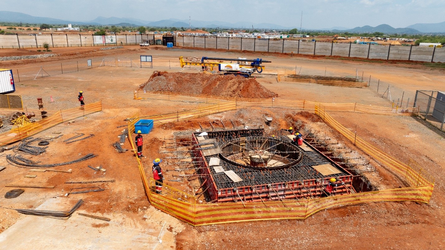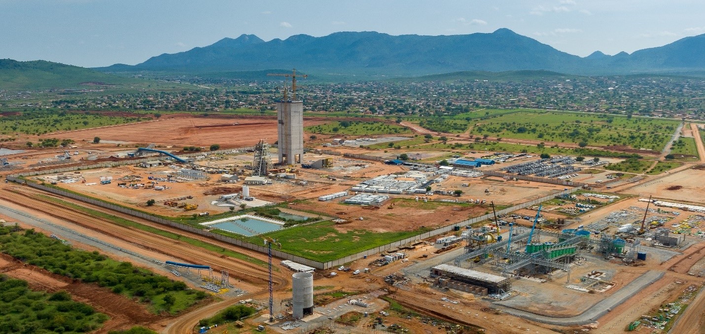卡莫阿–卡库拉 I 期和 II 期选厂的鸟瞰图 (前),以及年产50万吨/年一步炼铜冶炼厂的施工现场 (右)。 冶炼厂具有先进技术,将是非洲最大型的铜冶炼厂。