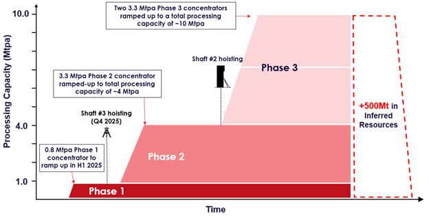 - 普拉特瑞夫项目计划于2024年下半年对II 期优化方案进行更新的独立可行性研究,在3 号竖井安装提升设备,将综合处理产能提升至400万吨/年,以加快II 期项目发展 。