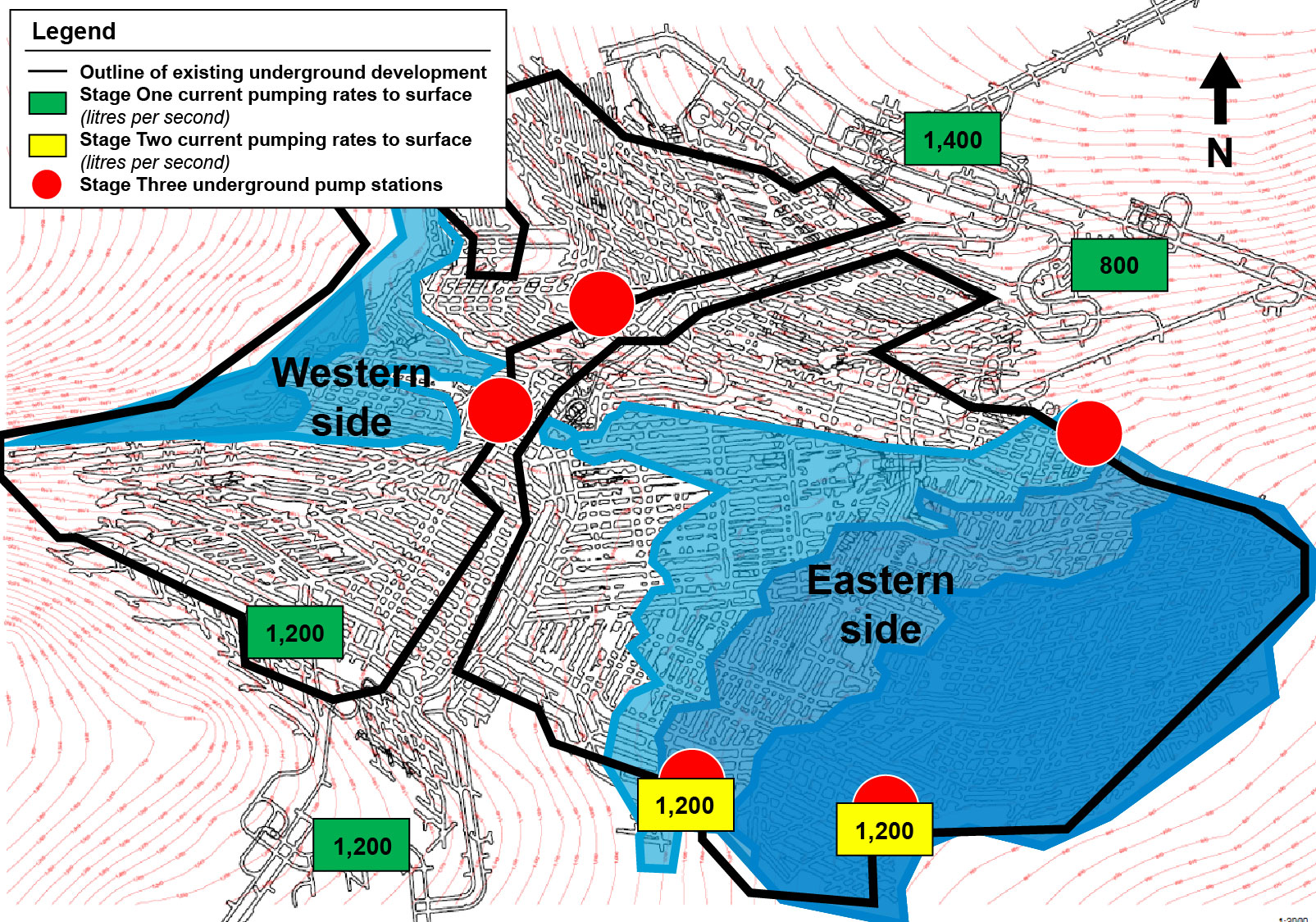 - 迄今为止,已修复了约13公里的水平开拓巷道。随着水位逐渐下降,采矿班组正集中将第一阶段的井下水泵搬迁安装至新的区域,以及通往第三阶段水泵站的井巷工程 (目前在水位以下) 的修复工作。采矿班组将于11月份开始使用第三阶段可用的抽水设施。