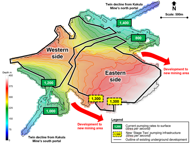 图2:卡库拉矿山现有的井下基础设施,显示当前和未来的抽水能力,等势线显示采矿作业的深度。