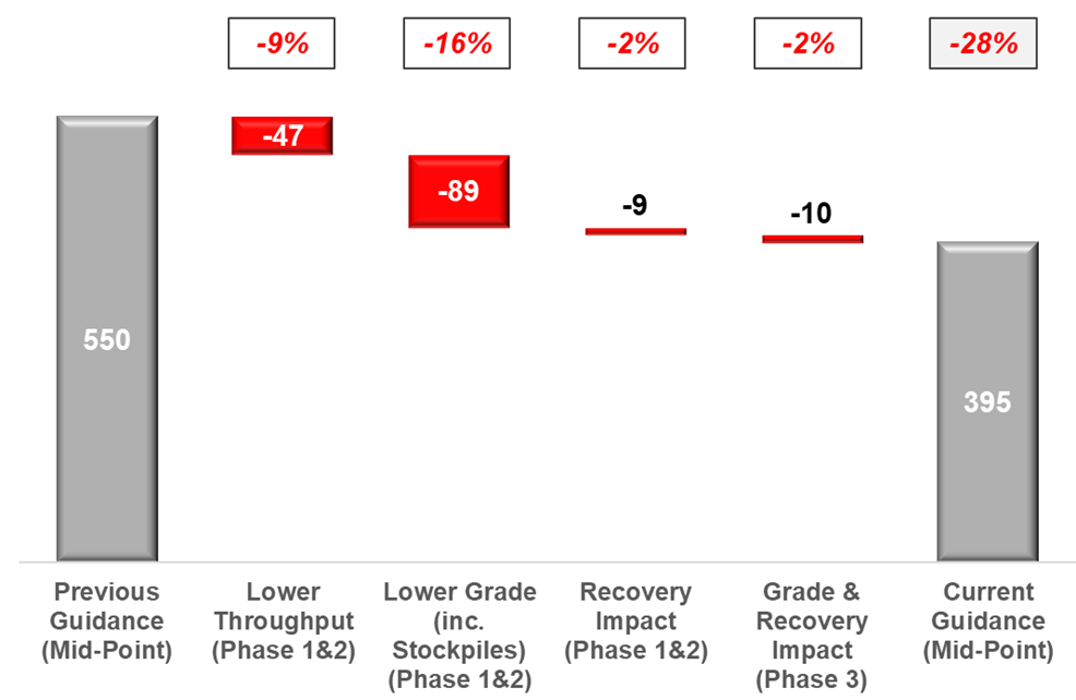 图4:2025年原产量指导目标至修订后的瀑布图分解,数字显示受影响铜金属产量(千吨)和百分比