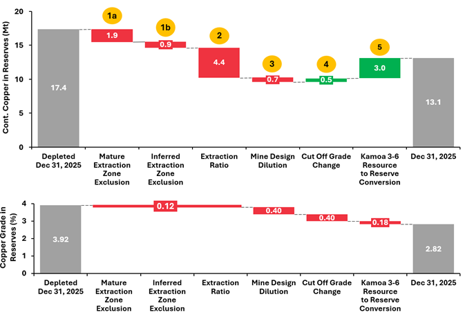图2概述了卡莫阿–卡库拉2025矿产资源量和矿产储量估算与截至2022年12月31日技术报告中矿产储量的矿石量和品位对比。