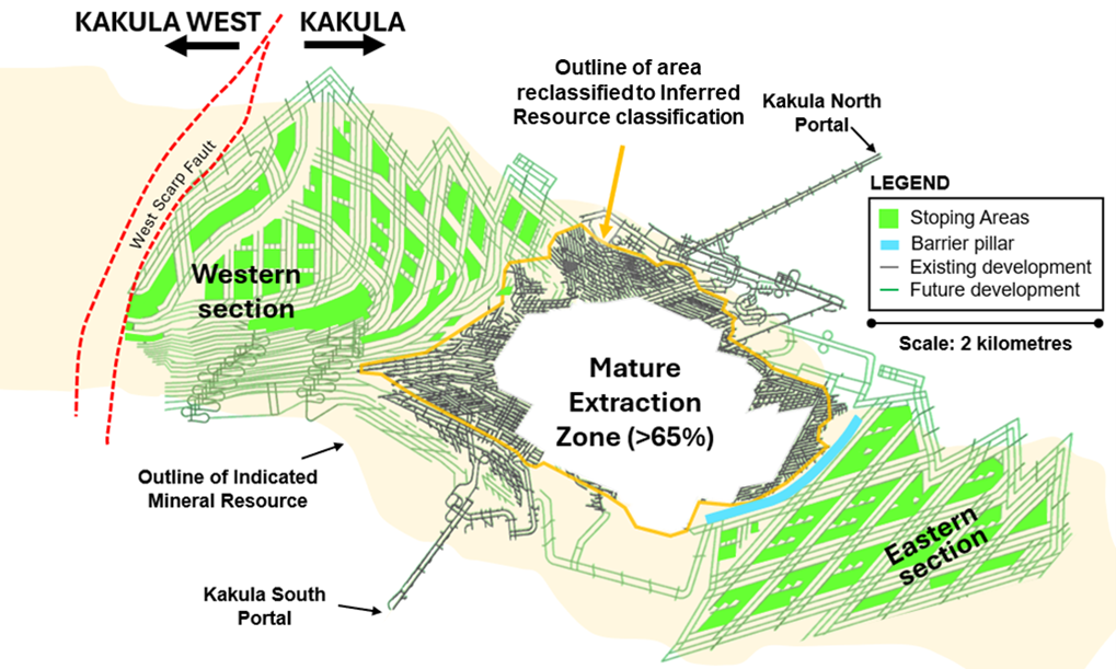 图3﹕卡库拉全新矿山规划的平面图,显示现有矿区以及位于卡库拉旧采区东西两侧的新采区。成熟采区并未纳入2025矿产资源量和储量估算。重新分类后的推断资源区 (橙色框线),并未纳入卡库拉2025矿产储量估算。