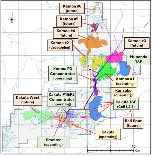 图4﹕卡莫阿–卡库拉400平方公里的权证范围,显示了在产矿山 (黄色)和其它矿床 (橙色) 的矿产储量估算,以及地表基础设施 (绿色)。
