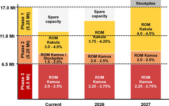 卡莫阿 (Kamoa)1区、卡莫阿2区和卡索科 (Kansoko)地下矿山 (合称“卡莫阿矿山”)的综合采矿能力将从目前约650万吨/年增加至2026约850万吨/年,并于2027年达到1,000万吨/年以上。预计该阶段来自卡莫阿矿山的矿石平均品位约2.5%。