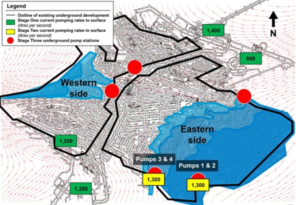 第二阶段水泵位置以下约有2,200兆升水,将利用第三阶段的抽水设施逐步排出。淹井事故并没有波及卡库拉矿山东区提高采矿能力的关键路径,也即在保安矿柱以东的远东新采区。日后进行采矿之前,将利用与第二阶段排水系统类似的技术,在作业面抽水以降低风险。