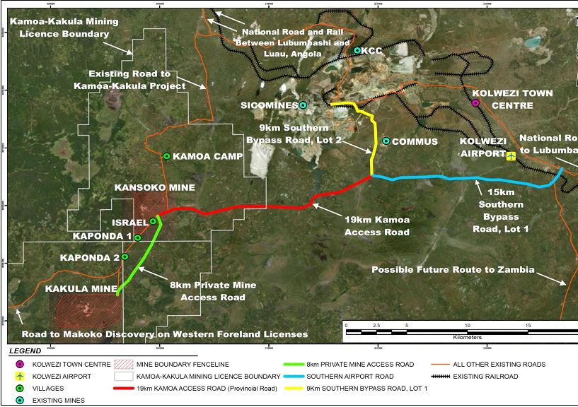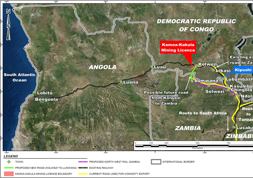 Figure 1: Map showing roads linking Kamoa-Kakula to Kolwezi airport, Lubumbashi, Luau (Angola), and the proposed road to Zambia.