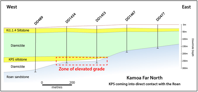 The Far North exploration target is the more typical stratiform mineralization characteristic of the majority of the Kamoa-Kakula copper deposits. The high-grade zone follows a north-south trend controlled by growth faulting and by the pinching out of the basal diamictite and the KPS against the Roan sandstone on the western flank of the Kamoa Dome. The pinching out results in the sulphide-rich upper portion of the diamictite and the KPS being brought into direct contact with the Roan Aquifer, resulting in the high copper grades seen at Kamoa Far North (see Figure 11 for an illustration). The resulting mineralized corridor trends for more than nine kilometres and is projected to continue onto the adjacent Western Foreland exploration licences.