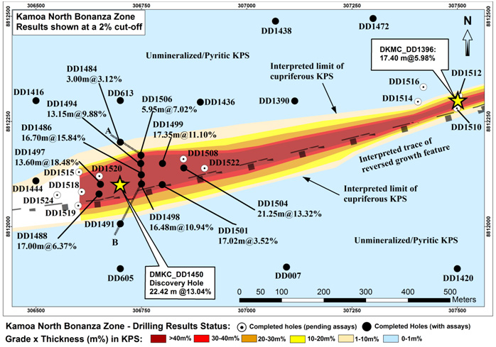 Recent drilling has confirmed that the discovery zone of bonanza-grade copper mineralization at Kamoa North ─ the Kamoa North Bonanza Zone ─ is continuous over a strike length of at least 350 metres and a width of up to 60 metres. The mineralized zone has a drilled thickness of between six and 30 metres, and is approximately 170 to 220 metres below surface, with grades ranging as high as 18.48% copper over 13.6 metres, at both a 2% and a 3% cut-off grade.