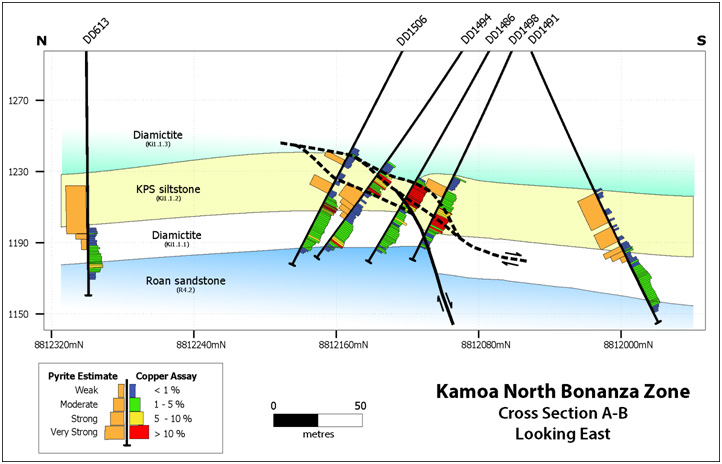 The ultra-high copper grades intercepted to date in the Kamoa North Bonanza Zone are believed to be the result of the controlling east-west growth fault structure having allowed oxidized, copper-rich brines to bypass the lower redox interface at the Roan-Nguba contact that is the typical mineralized horizon at Kamoa-Kakula. Instead, the copper-rich brines accessed the overlying, highly-sulphidic and reduced KPS, resulting in a new, upper mineralized zone hosted in the KPS and characterized by the bonanza-grade copper found in the vicinity of hole DD1450.