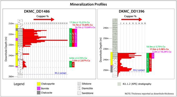 - DD1486 intersected 16.70 metres of 15.84% copper, at a 3% and 2% copper cut-off, in semi-massive sulphide KPS-hosted mineralization, beginning at a downhole depth of 215 metres; and 17.46 metres of 15.21% copper at a 1% cut-off.