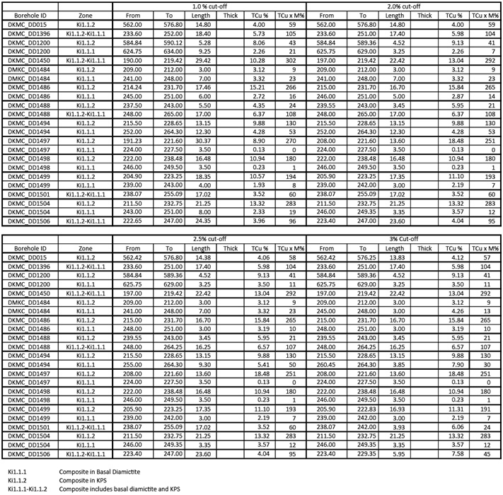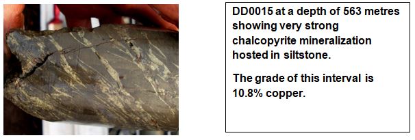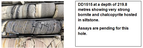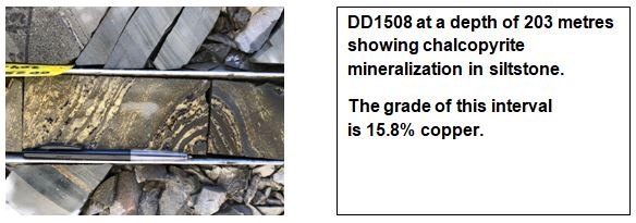 - DD1499 intersected 16.93 metres of 11.31% copper, at a 3% copper cut-off, and 17.35 metres of 11.10% copper, at a 2% copper cut-off, in semi-massive sulphide KPS-hosted mineralization, beginning at a downhole depth of 205 metres; and 18.35 metres of 10.57% copper at a 1% cut-off.