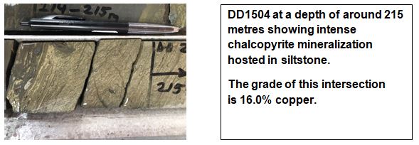 - DD1504 intersected 21.25 metres of 13.32% copper, at a 3%, 2% and 1% copper cut-off, in semi-massive sulphide KPS-hosted mineralization, beginning at a downhole depth of 211.15 metres.