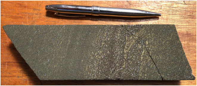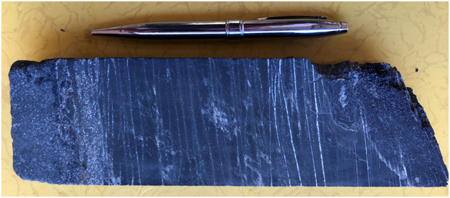 Figure 9: Very strong chalcopyrite mineralization in siltstone from a depth of 221.8 metres in new hole DD1524. Assays are pending for this high-grade hole, which currently is defining the western limit of the 350-metre drill tested zone.