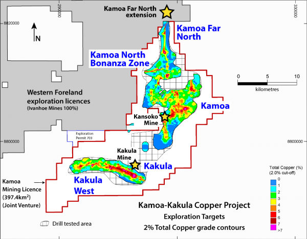 Figure 1: Kamoa-Kakula mining licence, showing the Kamoa North Bonanza and Kamoa Far North zones, the new Kamoa Far North extension discovery on Ivanhoe’s 100%-owned exploration licences, and the planned mines at Kakula and Kansoko.