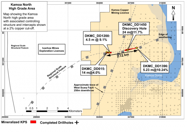 Five rigs are extending and infilling the central and eastern portions of the implied 2.7-kilometre Kamoa North Bonanza mineralized corridor, and a sixth rig is drilling high-grade mineralization around holes DD0015 and DD1200 located to the west of the major north-south trending West Scarp Fault, which down drops the high-grade discovery zone by approximately 250 metres.