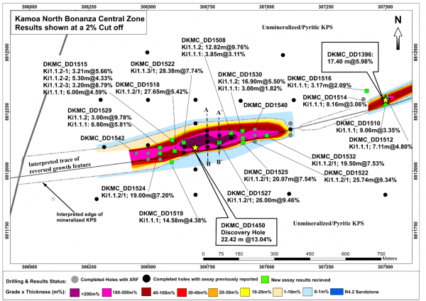 Assay results for 19 new holes have been received from the Kamoa North Bonanza Zone (see tables 1 and 2 on pages 13 and 14 for a complete list of assays).