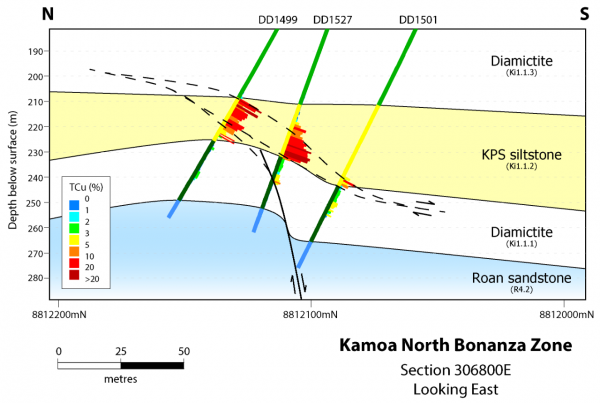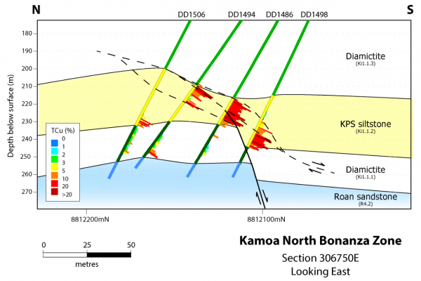 The central and eastern portions of the Kamoa North Bonanza Zone have drilled thicknesses of between six and 36 metres, and are approximately 170 to 220 metres below surface, with grades ranging as high as 18.48% copper over 13.6 metres, at both a 2% and a 3% cut-off grade.