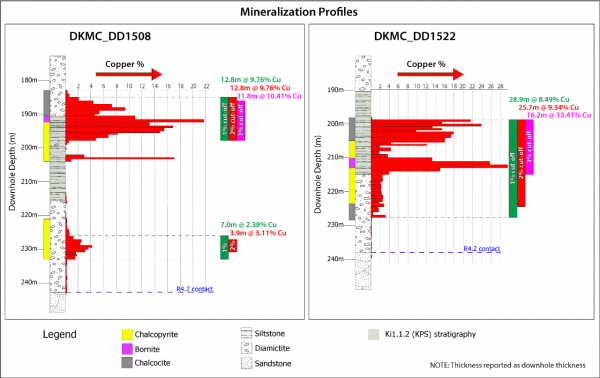 - DD1522 intersected16.24 metres of 13.41% copper, at a 3% copper cut-off, and 25.74 metres of 9.34% copper, at a 2% copper cut-off, in semi-massive sulphide KPS-hosted mineralization, beginning at a downhole depth of 198.7 metres; and 28.89 metres of 8.49% copper at a 1% cut-off.