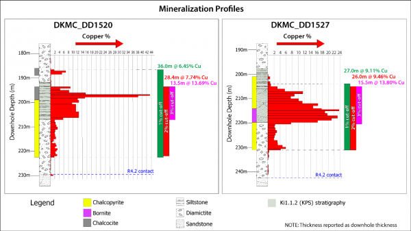 - DD1527 intersected15.50 metres of 13.80% copper, at a 3% copper cut-off, and 26.00 metres of 9.46% copper, at a 2% copper cut-off, in semi-massive sulphide KPS-hosted mineralization, beginning at a downhole depth of 205.0 metres; and 26.00 metres of 9.46% copper at a 1% cut-off.