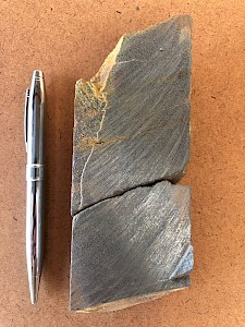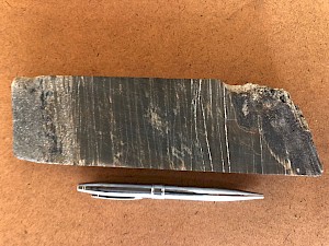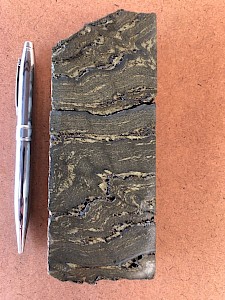 The growth fault structure is characterized by a wide zone of sub-parallel, low-angle, fault planes dipping at approximately 40 degrees to the south through the KPS (see Figure 4). Replacement of pyrite in the vicinity of these fault planes, as a result of a combination of cross-stratal and stratabound fluid flow, has resulted in mineralization that transects the KPS from top in the north to bottom in the south.
