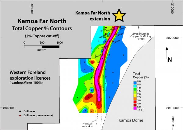 Drilling on Ivanhoe’s 100%-owned Western Foreland licences, immediately north of the northern border of the Kamoa-Kakula mining licence, has confirmed the extension of the Kamoa Far North high-grade trend onto Ivanhoe’s licences for at least 400 metres.