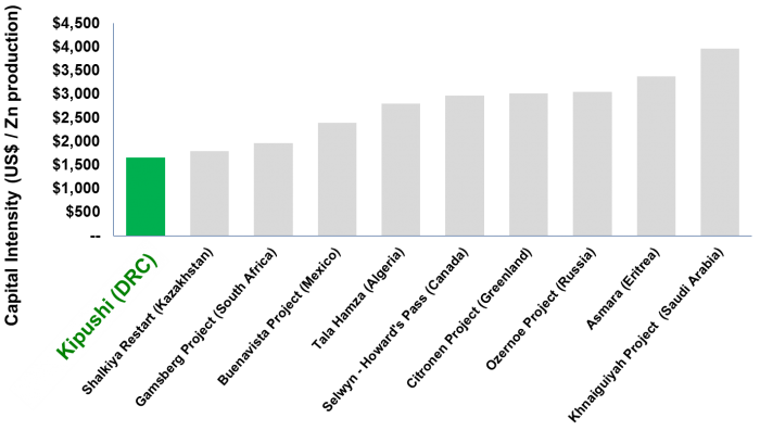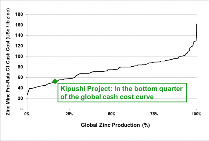 - Life-of-mine average cash cost of US$0.54/lb of zinc is expected to rank Kipushi, once in production, in the bottom quartile of the cash cost curve for zinc producers globally.