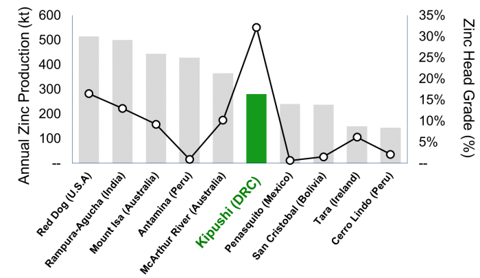 - Life-of-mine average planned zinc concentrate production of 530,000 dry tonnes per annum (tpa), with a concentrate grade of 53% zinc, is expected to rank Kipushi, once in production, among the world’s major zinc mines (see Figure 1, below).