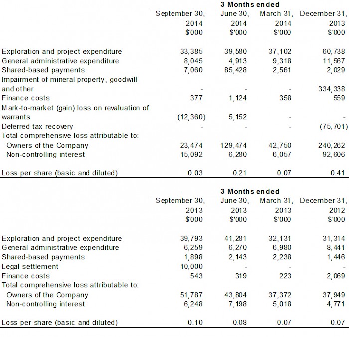 Exploration and project expenditures for the three months ending September 30, 2014, were $6.4 million less than for the same period in 2013. Expenditure at the Kamoa Project decreased by $4.8 million compared to the same period in 2013; however, the costs directly attributable to the construction of the Kamoa box cut were capitalized as development costs and therefore do not form part of the expensed amount.
