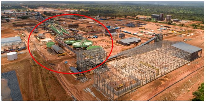 Another view of Kamoa-Kakula’s Phase 1, 3.8-Mtpa concentrator (in red circle) is nearing completion, with the civil works for the second 3.8-Mtpa concentrator (Phase 2) advancing rapidly. Roofing of the concentrate storage shed (foreground) is underway.
