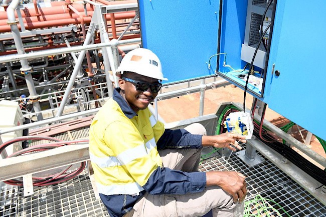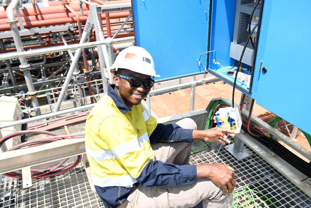 Papi Seokolo, Technician, installing fiber optic cables in the Phase 1 concentrator plant.