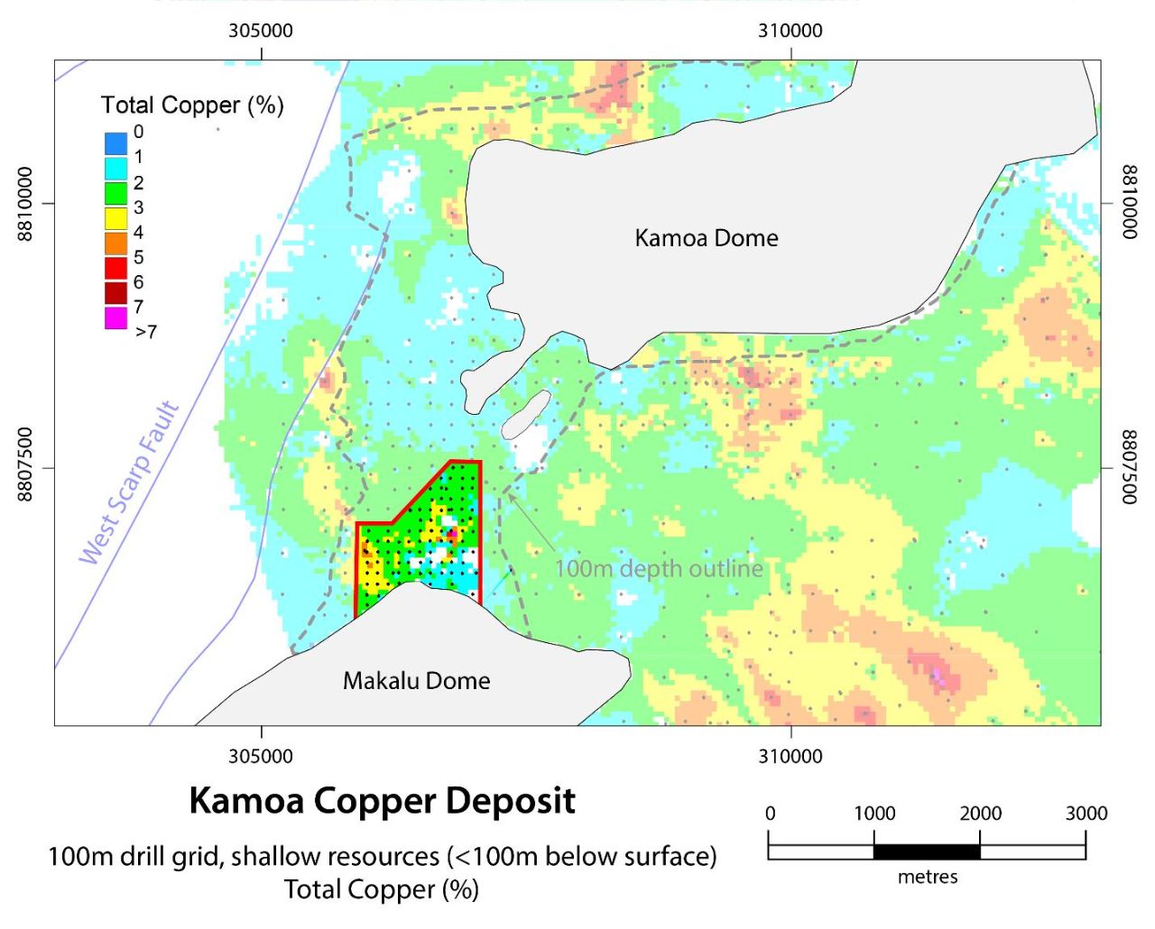 Shallow resources outlined in red drilled at a 100-metre grid spacing, north of the Kansoko Mine, between the Kamoa and Makalu domes.