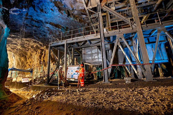 Mine engineers at the underground ore transfer station at the Kakula Mine, which is expected to be fully operational in April.